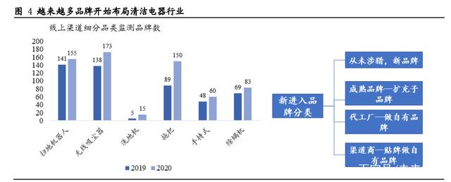 产品矩阵逐渐丰富,品牌数量不断扩容。国内的清洁电器最早可以追溯到1978年的第一台吸尘器,经过43年的发展,形成了日益丰富的产品品类。按照性能和场景来看,目前国内的清洁电器主要可以分为扫地机器人、手持类清洁电器和商用机器人三大产品线。其中,机器人品类以扫地机器人为主,能够实现人力的完全解放;手持清洁器包含吸尘器、拖把以及吸拖一体的洗地机;商用机器人正处于应用初步落地阶段。