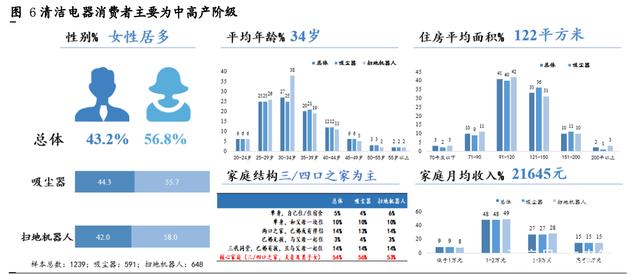 清洁电器消费者主要为三/四口之家,月收入以及住房面积都处于中等偏高水平。根据中怡康数据,清洁电器的购买者以女性居多,主要年龄在30-40岁,拥有稳定的职业和收入,住房平均面积为122平方米,家庭月平均收入为21645元。当前主要客群集中在中产阶级以上和80-90后的交叉部分,之后随着更加重视自我感受、愿意为品质生活付费的Z世代消费力崛起,清洁电器的潜在消费群体有望实现增量扩容。