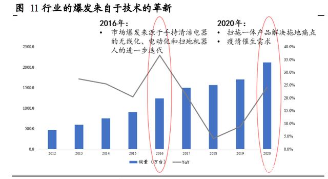 清洁电器的真实需求是由供给端的革新持续创造出来的,行业每次大爆发的源动力都来自于技术革新。我们认为清洁电器的崛起是生产厂商通过消费者洞察,发现和创造顾客并没有提出要求、但他们会热情响应的产品,从而直击消费者痛点以创造需求。之前清洁电器的行业规模之所以比较小,是因为技术端的革新没有达到解决消费者痛点的水平,而这两年持续的技术创新让潜在消费需求不断落实。