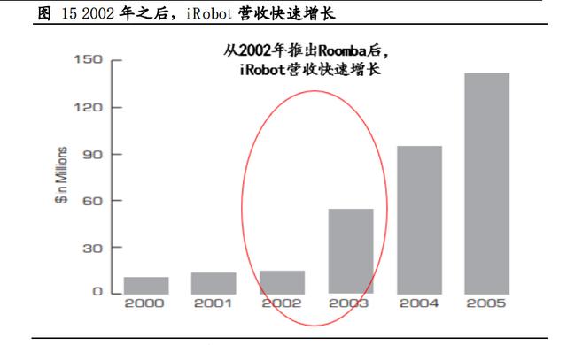 2002年,Roomba首创的随机清扫算法有效减少了机器人身上冗余和昂贵的传感器,行业正式迈入家用级门槛。iRobot创业团队主要来自MIT计算科学和人工智能实验室,具有深厚的机器人研发经验,公司早期的项目涉及太空探测和军用机器人。公司在2002-2011开始开发扫地机器人,于2002年推出了随机碰撞式Roomba 400,将红外感应技术与扫地机器人相结合,为家庭清洁带来了新的答案。起初iRobot公司只生产了15000多台,但是在发布会上就销售了1万多台。这款产品直接把扫地机器人的价格打到200美元/台,与当时的现有产品相比出现了的断崖式的价格下调,因此引领扫地机进入了千家万户,成为了大众可以接受的消费品。在2002年推出产品后,公司营收也实现了快速增长。