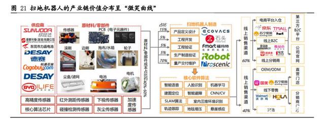扫地机器人产业链上游涉及塑料、金属等原材料以及电子元器件、电机、电池等零部件,其中大部分零部件标准化较强,相关厂商的可替代性强、议价能力弱;在产业链中游,除了iRobot、科沃斯这类的品牌研发商外,也逐渐形成了杉川这类的具有整体解决方案能力的ODM商,他们没有自有品牌,但是品牌提供贴牌服务,这直接降低了非专业厂商进入扫地机器人行业的门槛。此外,欣旺达、深圳长城电子等OEM厂商也开始拓展扫地机器人代工生产服务,这为诸多不自产的品牌商提供了轻资产运营的产业条件。正是由于上游零部件的日益标准化、ODM和OEM商的日益成熟化,众多没有生产资源的玩家才有了进入扫地机器人行业的“入场券”。