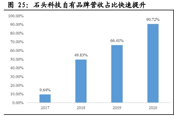 2017年,石头开始发展自有品牌,并不断向高端化产品进阶。2017年至2020年,石头科技自有品牌销售额占比从9.64%增长到90.72%,2020年,石头科技共销售238.4万台扫地机器人,实现销售收入43.5亿元,这其中绝大部分是石头科技自有品牌。石头科技坚持高端定位,占据行业中高价位段,持续创新且在发达市场成功树立高端品牌,预计销量增速高于行业增速且价格中枢持续向上。自有品牌战略和高端化战略下,石头的盈利能力也在逐年提升。