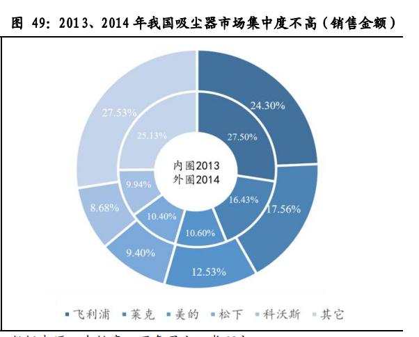 在此阶段,卧式吸尘器占比最高。根据中怡康数据,2014年5月,在国内吸尘器所有品类中,卧式吸尘器零售额占比70%左右,零售量占比80%左右;2015年卧式品类市场份额有所下滑,5月份零售额占比为61%,,零售量占比小幅下滑至75.8%。桶式吸尘器以商用为主,自身功能全面、能够处理所有其他吸尘器所不能吸的垃圾废弃物,若干特点决定了其占比虽低,但萎缩速度慢、仍未被取代。