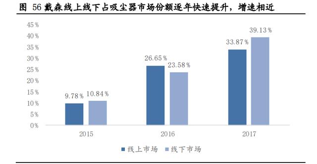 戴森能迅速打开并抢占中国市场的第二个原因在于其线上线下全渠道的铺设,实现两端同时发力。戴森选择熟悉奢侈品品牌运营的香港捷成集团作为其代理商,快速铺设了线上、线下渠道。2013年,在16 个月内,戴森已完成200余家门店的铺设;2014年,线下渠道方面,戴森开始进入苏宁、国美等 KA 渠道,同时发力线上渠道,打造京东戴森官方旗舰店;在2016年,戴森实现全渠道的自主运营。戴森线上线下渠道两手抓,实现了2016年线上、线下市场份额172.5%、117.5%的高速增长。