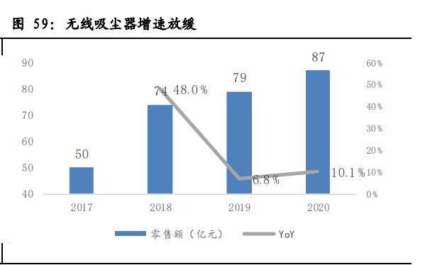 2016年开始,我国行业变革的另一个显著特点是进入无线化时代,以无线吸尘器为代表的丰富新品类成为行业增长引擎。2016年我国国内市场吸尘器销量突破一亿台,同比增长近19%,2016-2018年三年复合增速达15%。其中,无线吸尘器是行业增长的主要驱动力,它解除了传统吸尘器只能吸地板的限制,将吸灰的场景拓展到天花板、吊灯等更多维的层面,从而提供了更完善的灰尘脏污清理方案。